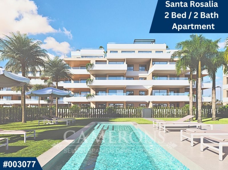 New apartments with communal pool in the Santa Rosalia Lake Resort, on this man made lagoon in an excellent location, just 4km’s from the beaches of the Mar Menor and only 1km from the 18 hole golf course.Modern apartments with 2 and 3 bedrooms and 2 bathrooms, the upper levels have fantastic lake views.The end result will be a stunning five star development offering a choice of apartments and villas built by various property developers that have already bought land on the resort.The resort is situated between the town of Torre Pacheco and Los Alcázares. Torre Pacheco is a large inland town which has some unique places of interest to offer everyone.The town centre is relatively spread out and has a good selection of shops and eateries. The best day to visit is on Saturday morning when the lively street market adds to the atmosphere. Click here for 3 bed option