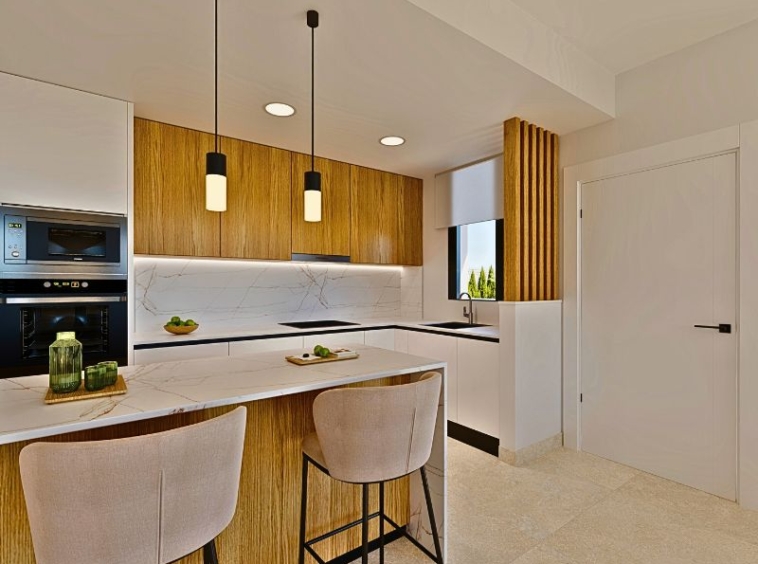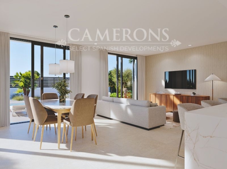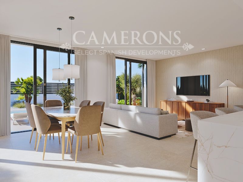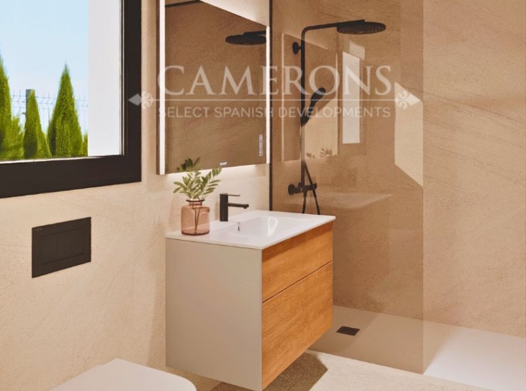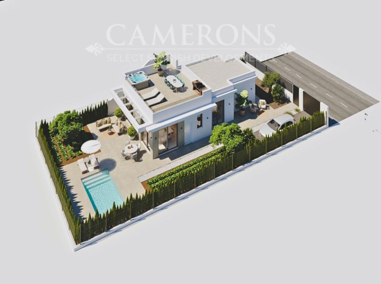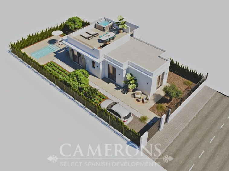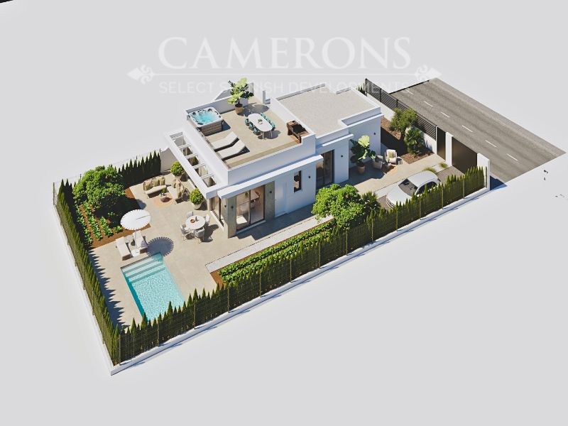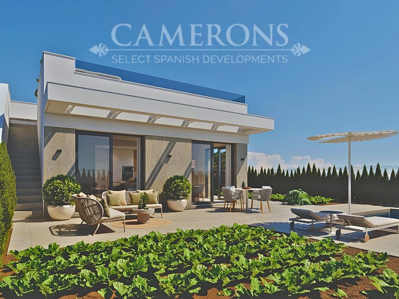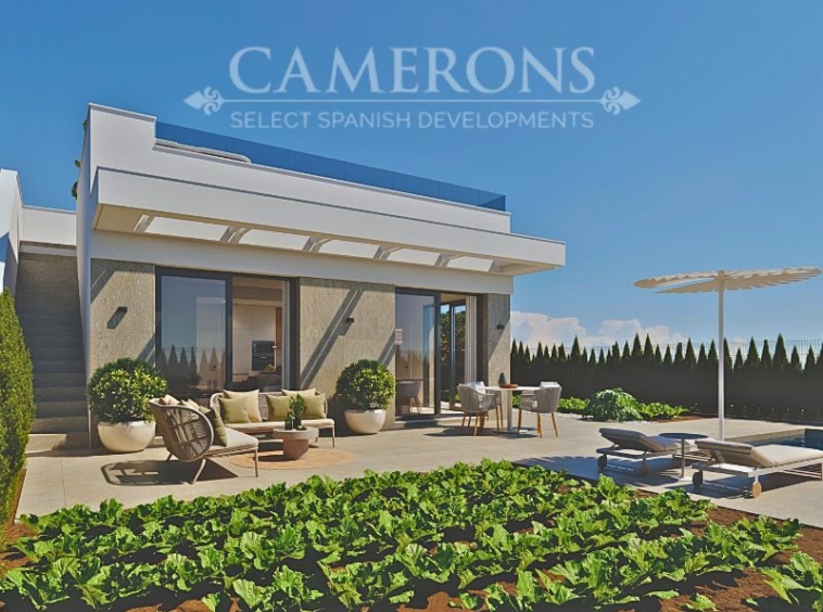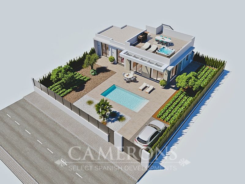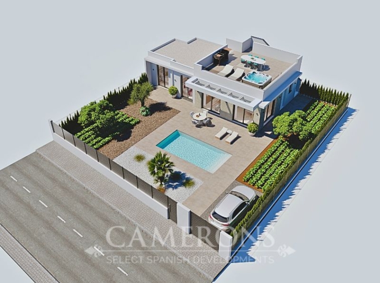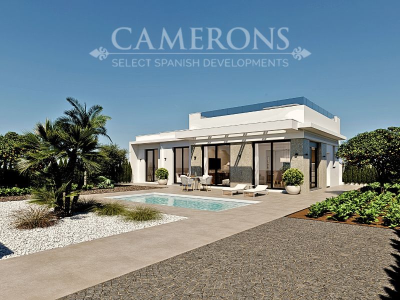 LAST 1 REMAINING!!! New Project of 2 or 3 bed villas, both with 2 bathrooms, all on one level villa with plots up to 550m2.Complete with private pool and solarium.Open plan lounge and kitchen, with a dining area. The double windows in the lounge open onto a terrace and pool area. These properties bring the focus on the use of long-lasting materials and the highest quality finish. Hacienda del Alamo Golf resort is an exclusive residential area of Murcia. The internationally renowned resort has a magnificent Club House, as well as a Hotel and restaurant. The beautiful sandy beaches of Mazarron are only 15 minutes away by car. The area is well connected to airports and services.Click here to view 2 bed option